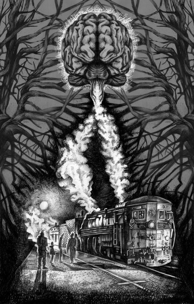 TP: Praca przebiegała różnie. Przeważnie punktem wyjścia był dla mnie napisany tekst, choć nie zawsze – przykładem może być okładka do Horologium, która powstała inaczej. Najpierw była grafika, która tak spodobała się pisarzowi, że zgodziłem się wykorzystać ją jako front książki.