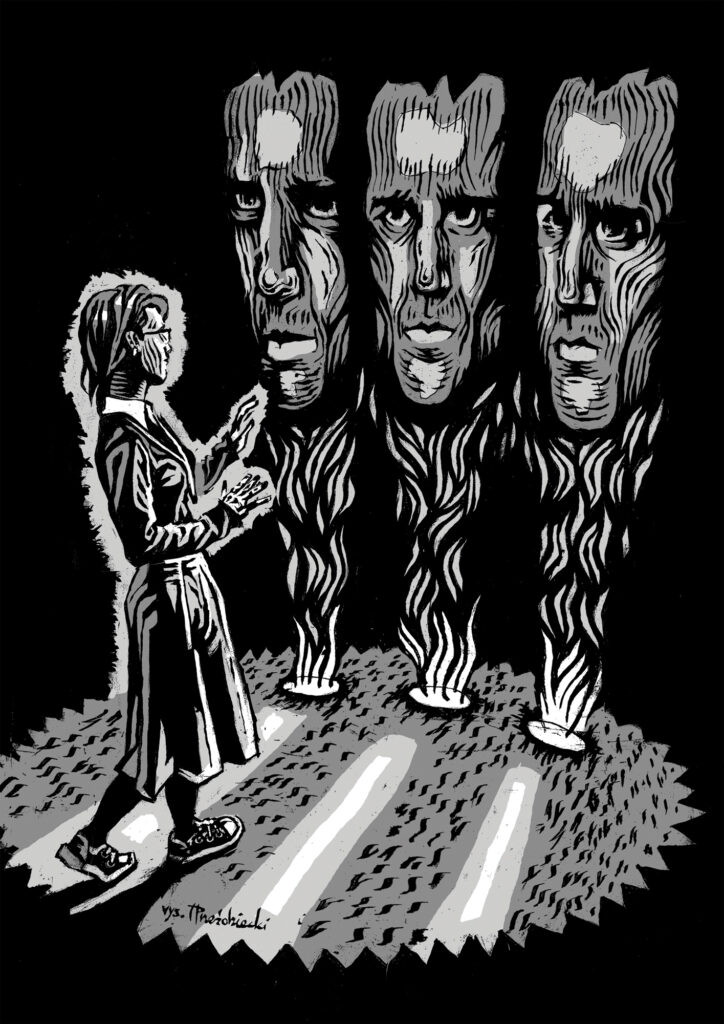 Spośród postaci, nad którymi pracowałem, szczególnie zapadła mi w pamięć dziwna, trójgłowa zjawa – hologram z powieści Horologium. Zadziałała na moją wyobraźnię jako coś wyniosłego, mrocznego, a zarazem budzącego strach. Nie chciałem, by były to zwykłe głowy, lecz formy odrealnione, nierzeczywiste.