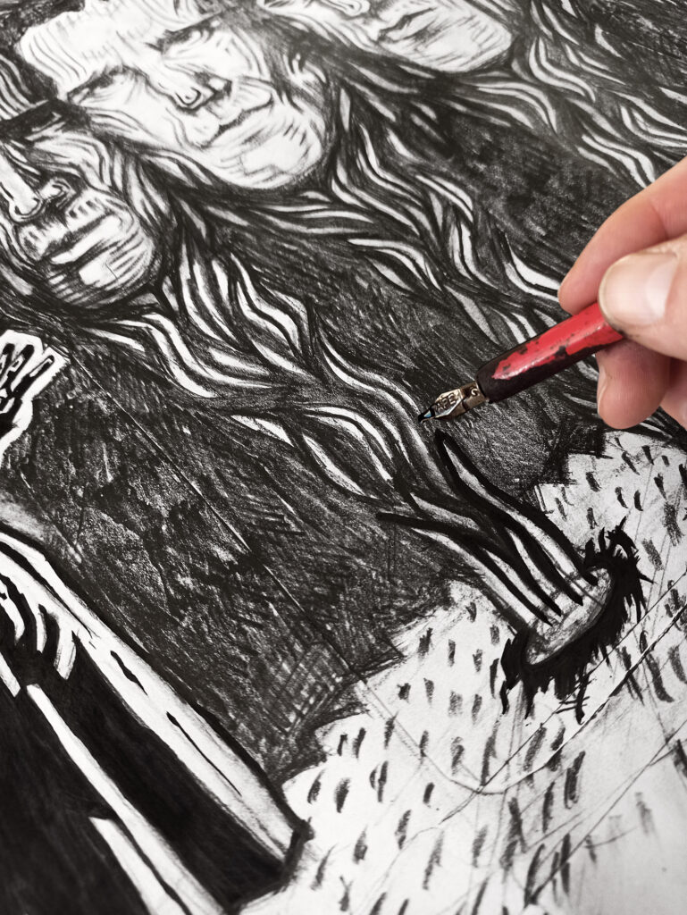 Dlatego bohaterowie moich rysunków zostali umieszczeni przeważnie na tle okien, w mrocznych korytarzach albo pod osłoną nocy, kiedy dominuje szarość, a widać jedynie cienie z blikami światła pochodzącymi z określonego źródła. Te ilustracje są utrzymane w pewnej konwencji i stylizacji, dlatego mogłem sobie pozwolić na odejście od realizmu. Warto pamiętać, że obraz jest jedynie subiektywnym przedstawieniem rzeczywistości, a nie samą rzeczywistością.
