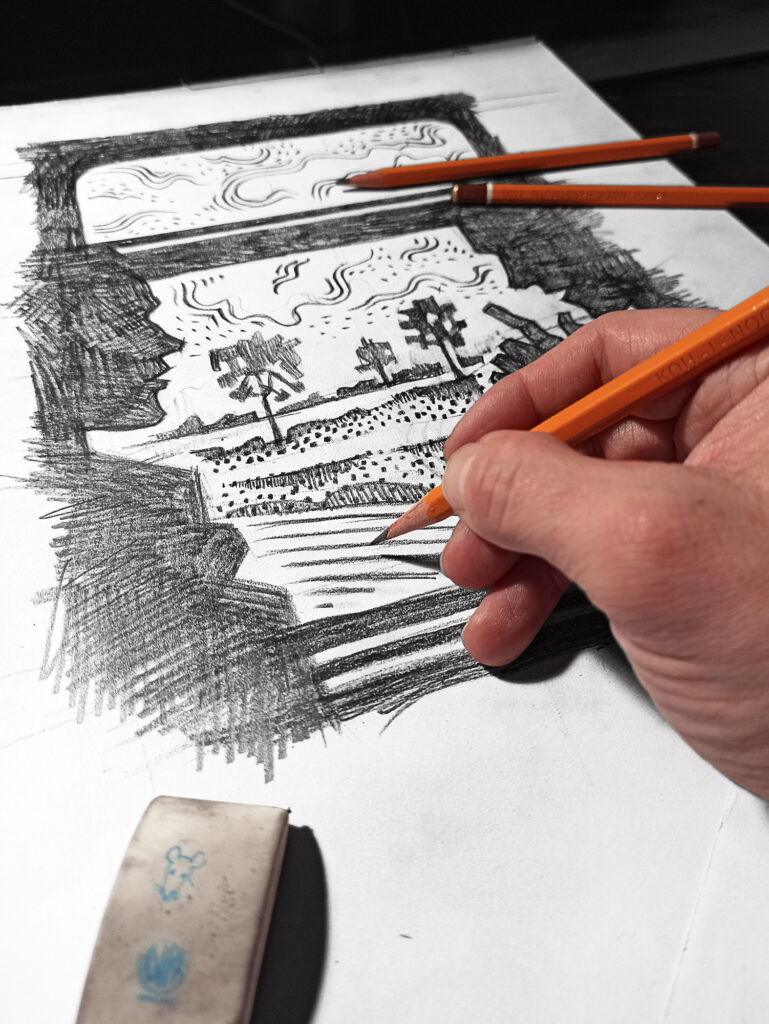 Musiałem włożyć sporo pracy w ostateczną formę wizualną. Zeskanowałem szkice i w programie graficznym długo ustalałem punkty zbiegu oraz wszystkie kierunki – z niemal architektoniczną precyzją. Na tej podstawie od początku, ręcznie, narysowałem całość już „na czysto”. Sporo czasu poświęciłem też na opracowanie liternictwa, które w całości namalowałem pędzlem i farbą.