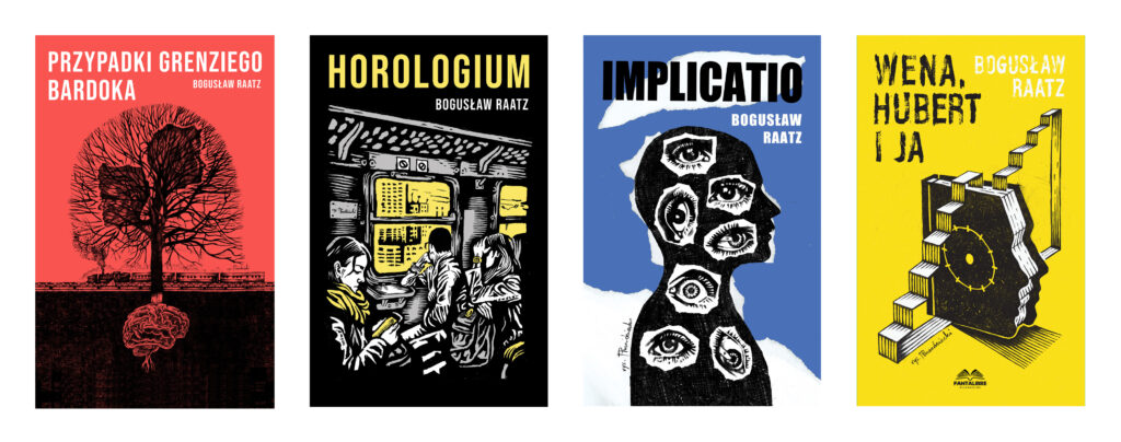 W tym momencie dochodzimy do mojej najbardziej owocnej i długotrwałej współpracy – ze świetnym muzykiem i autorem książek, Bogusławem Raatzem. Wspólnie wykonaliśmy kawał dobrej roboty, bo możemy się pochwalić czterema wydaniami: Przypadki Grenziego Bardoka, Horologium, Implicatio oraz Wena, Hubert i ja. Jest to dla mnie szczególnie wdzięczna współpraca, ponieważ pozwoliła szerzej zaprezentować moje możliwości jako projektanta okładek i ilustratora, a przy tym dawała mi dużą swobodę twórczą. Bogusław jest artystą, który doskonale rozumie, że najlepsze rzeczy powstają wtedy, gdy każdej ze stron pozostawia się twórczą wolność.
